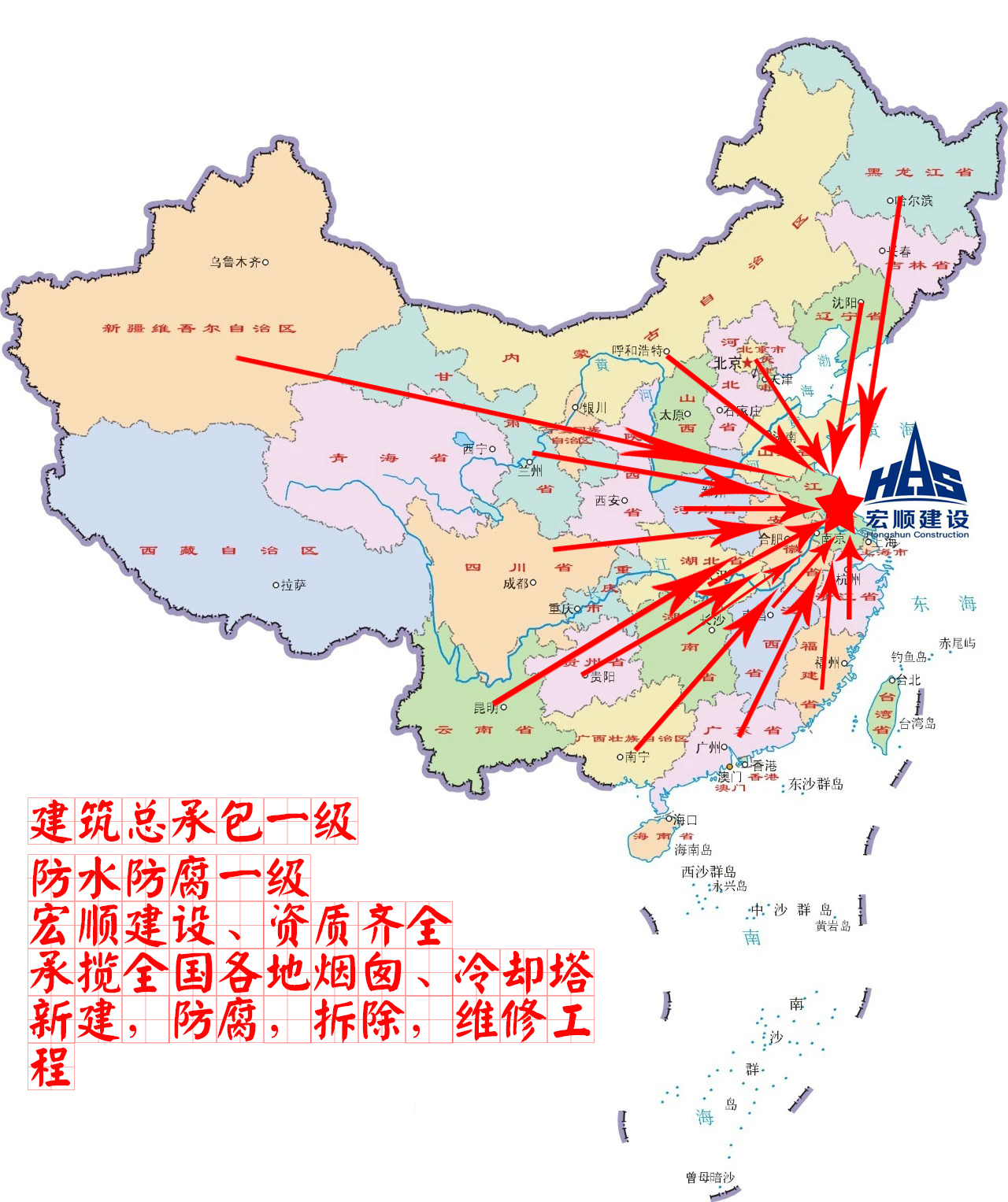 現有施工工地及業績的城市有:|北京|天津|包頭|淮北|大連|青島|煙臺|廈門|寧夏|太原|呼和浩特|沈陽|長春|哈爾濱|南京|寧夏|寧夏|福州|南昌|寧夏|鄭州|武漢|長沙||廣州|南寧|海口|成都|貴陽|昆明|西安|蘭州|西寧|銀川|烏魯木齊|。